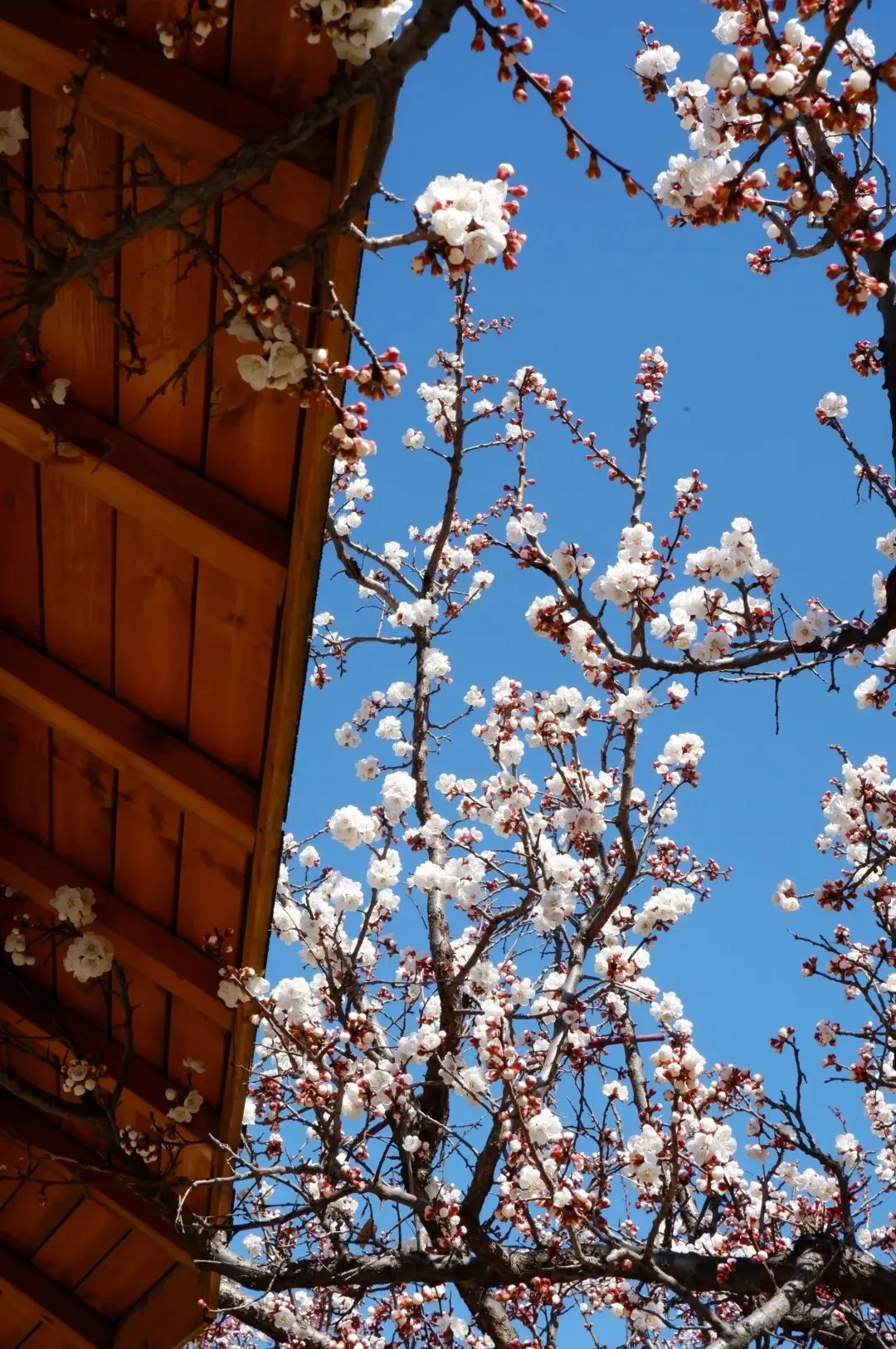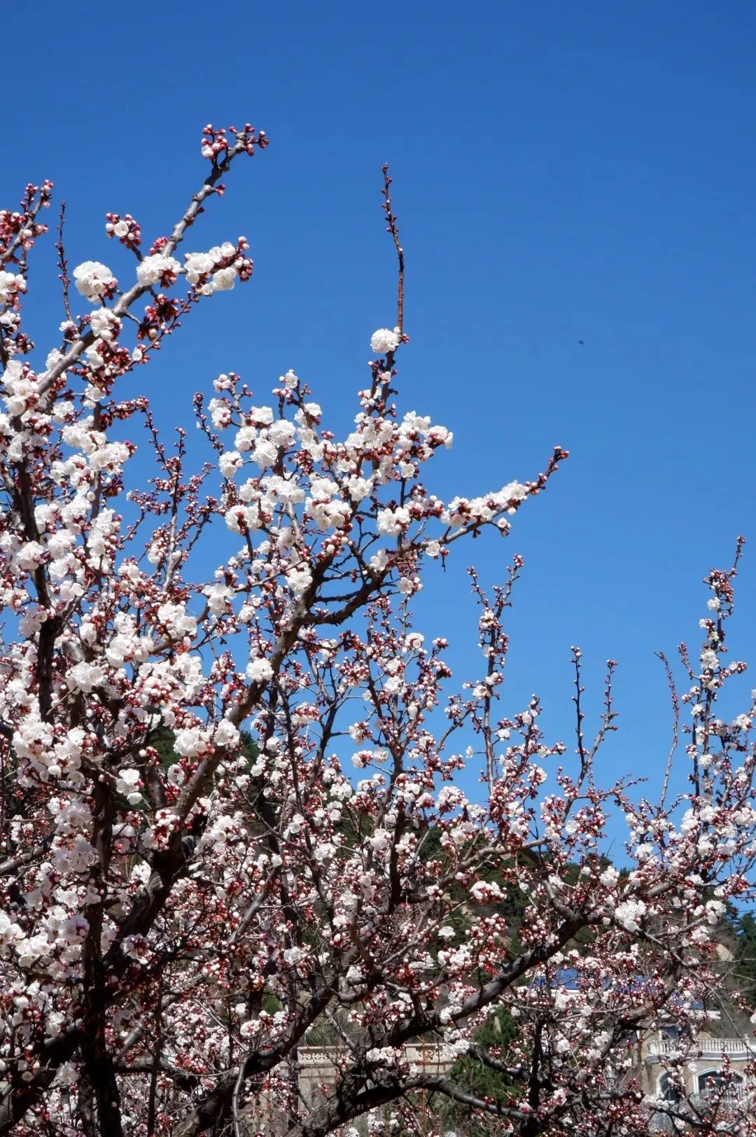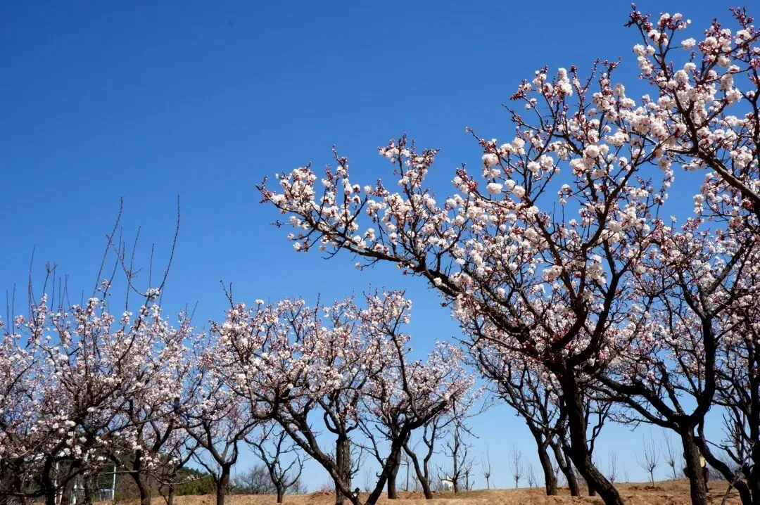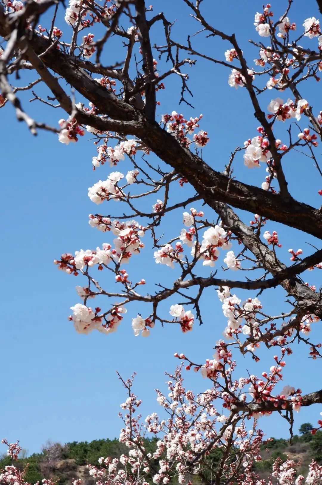 当天,车行驶到这边,人很少,天很蓝,花开得极好。我的第一感觉就是杏树,因为形状像极了梵高画里的杏树,低矮的,粗壮的,整齐的,黢黑的树干,圆滚滚的花骨,盛放的部分像在朝天大叫似的,好是爽朗和热闹。虽然明显是人工种植,但一点都不影响我们的观赏兴致。
