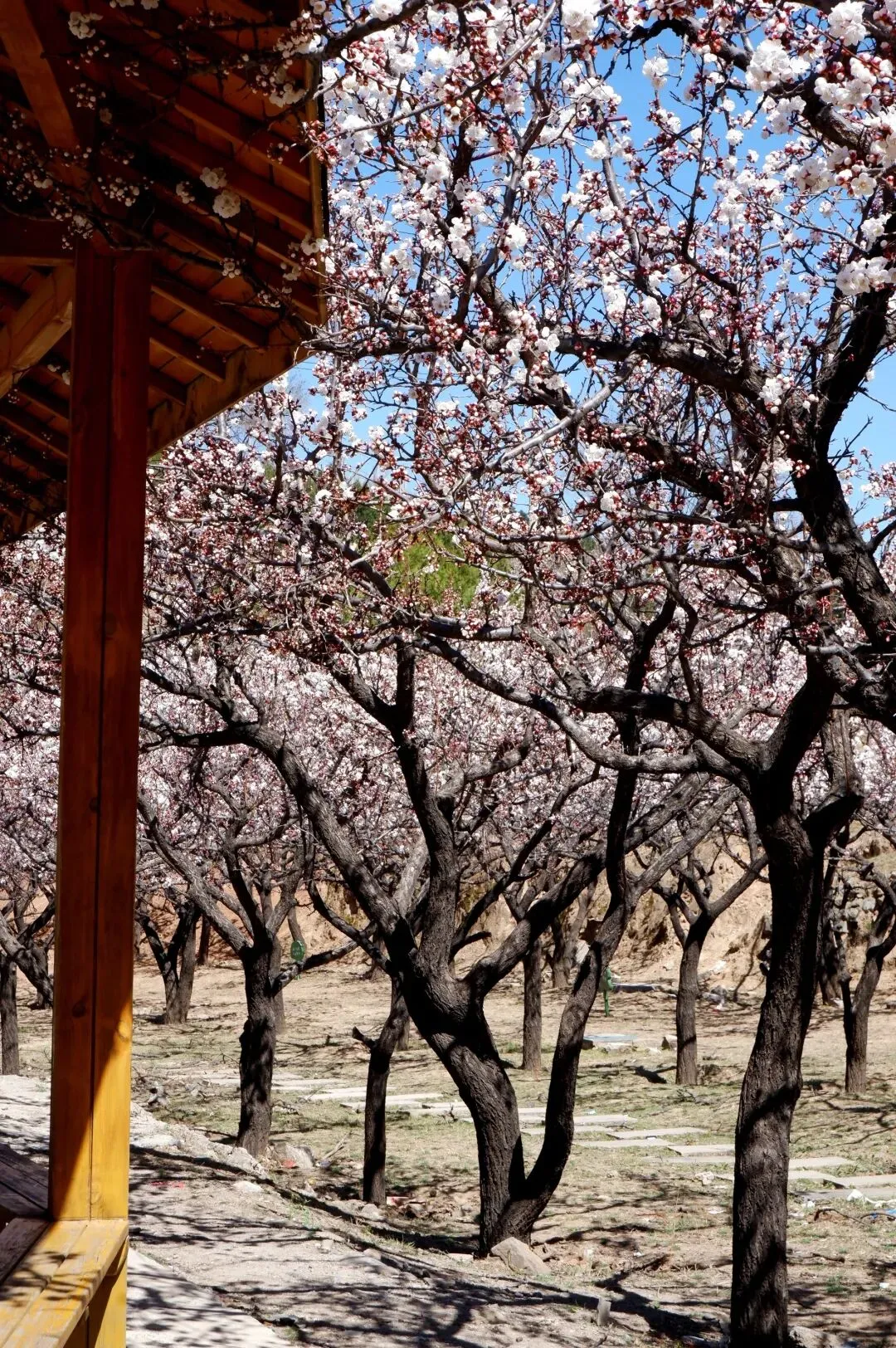 在偏桥沟景区,岔口处似乎有庙,看到了一片别墅区,欧式建筑,紧接着路过一小片杏树林。原本有些疲乏的我们,瞬间被此情景点燃。