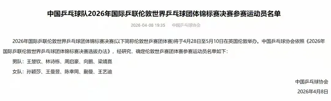 可这份耀眼的成绩,终究没能敲开世乒赛的大门。4月8日,中国乒协公布伦敦世乒赛男队名单,王楚钦、林诗栋、周启豪、向鹏、梁靖崑在列,温瑞博的名字彻底缺席。按照国乒选拔规则,直通名额需是多哈世乒赛冠军、全运会冠军、世界排名前二、澳门世界杯冠军或新加坡大满贯冠军,温瑞博一条都不满足。两次队内选拔赛,他均闯入决赛却先后不敌周启豪、向鹏,与直通资格擦肩而过;教练组综合评估的最后一个名额,最终给到了大赛经验更丰富、关键战更稳定的梁靖崑,即便温瑞博状态爆棚,也因技术存在接发球短板、关键战抗压能力存疑,被挡在世乒赛门外。