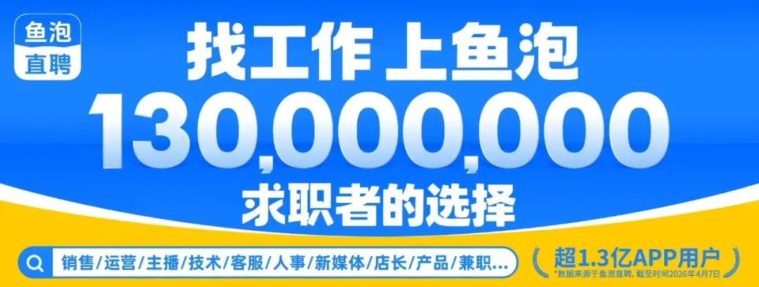 文中岗位均来自小程序👉鱼泡直聘 | 求职招聘找工作👈,如您有其他岗位意向,可点击上方红字查看更多岗位详情~