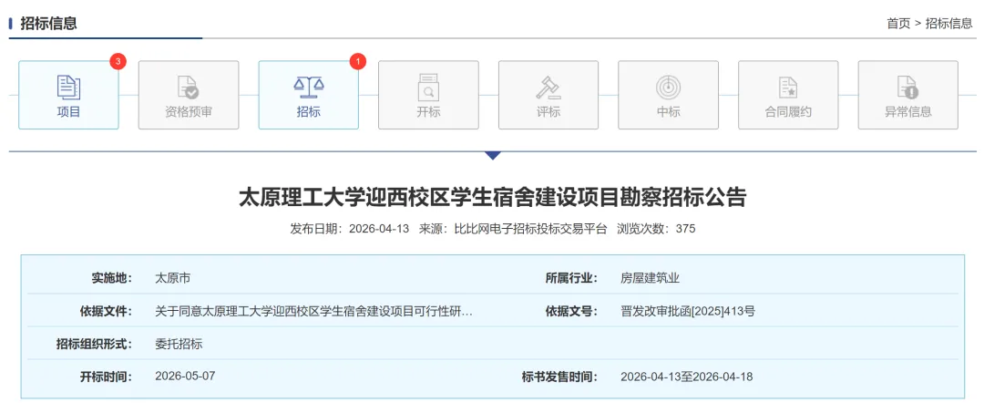 公告显示:本招标项目太原理工大学迎西校区学生宿舍建设项目勘察(招标项目编号:M1100000048005354001)已由山西省发展和改革委员会以晋发改审批函[2025]413号文件批准建设,项目资金来源为申请超长期特别国债、政府债劵和其他投资等多渠道解决,招标人为太原理工大学,项目已具备招标条件,现对该项目勘察进行公开招标。